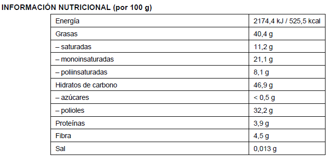 Aceites y grasas vegetales (nabina, palma), edulcorante (maltitol), almidón de maíz, cacao desgrasado en polvo (13,0%), pasta de avellana (4,0%), manteca de cacao, emulgente (lecitina de girasol) y aromas.