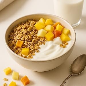 Copo de avena, cereal extrusionado (harina de proteína de guisante y harina de arroz), proteína soluble de trigo, aceite de girasol alto oleico, jarabe de glucosa, sal, gasificante (bicarbonato sódico) y aromas naturales. Fruta Tropical